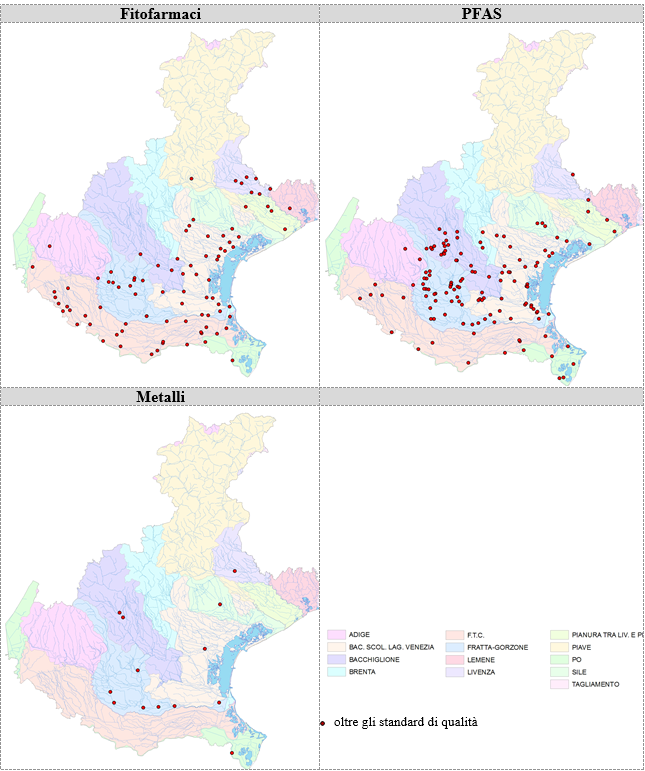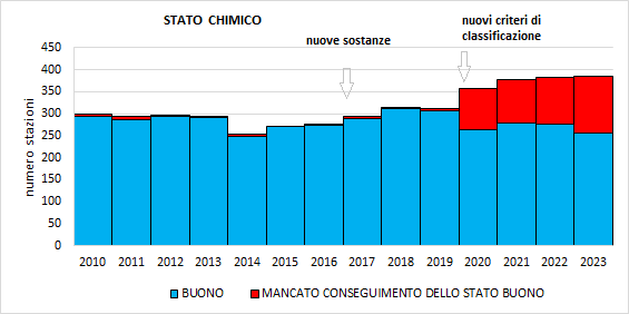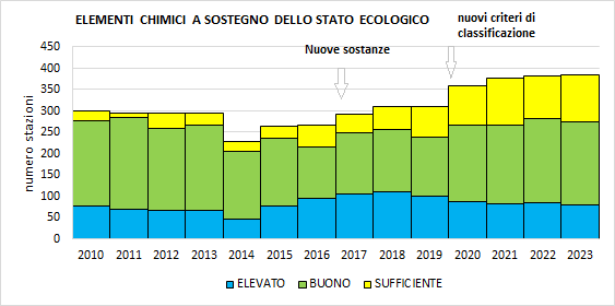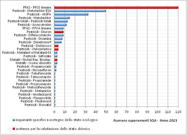 In tempi diversi, sono state introdotte nella valutazione dello stato chimico e degli inquinanti specifici a sostegno dello stato ecologico nuove sostanze ampiamente diffuse nell’ambiente fluviale come ad esempio: Glifosate e AMPA (prodotto di degradazione del glifosate) a partire dal 2016; Metolachlor ESA (prodotto di degradazione del Metolachlor) dal 2019; PFOS e PFOA dal 2020. Gli aggiornamenti normativi per la classificazione dello stato dei corpi idrici e l’affinamento del monitoraggio hanno comportato da una parte ad un continuo aumento del numero di superamenti degli SQA e dall’altra all’impossibilità di valutare correttamente un trend generale dello stato chimico e degli elementi chimici a sostegno dello stato ecologico dei corpi idrici.