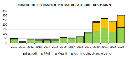 Il maggior numero di non conformità è dovuto alla presenza di fitofarmaci (171 superamenti) e PFAS (sostanze perfluoroalchiliche, 129 superamenti) seguiti dai metalli (6 superamenti)