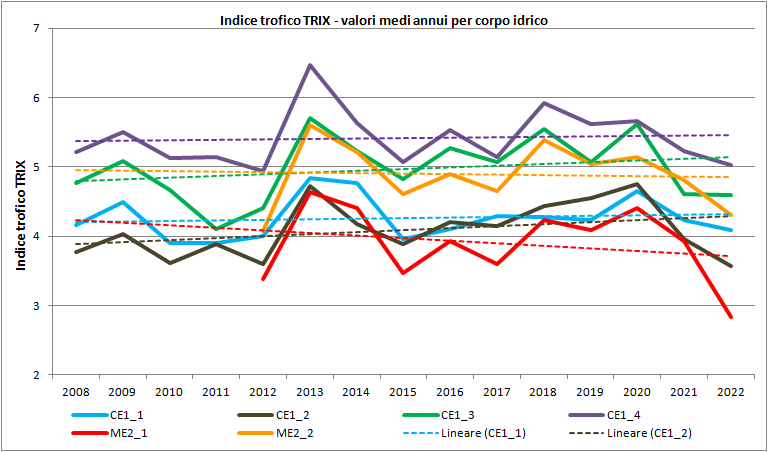Indice trofico TRIX - valori medi annui per corpo idrico negli anni 2008-2022 (Fig. 3)
