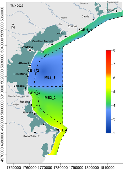 L’indicatore, utilizzando le classi di trofia ex D.lgs. 152/1999, vede raggiunti gli obiettivi Elevato ai corpi idrici CE1_2 e ME2_1 (antistanti la laguna di Venezia) e Buono ai c.i. CE1_1, CE1_3 e ME2_2; solo il c.i. CE1_4, localizzato nella parte meridionale di costa, presenta un valore medio di TRIX che rientra nella classe Mediocre.