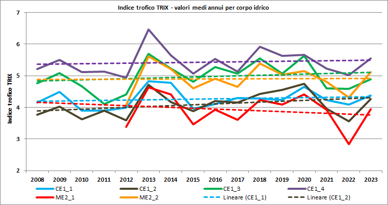 Indice trofico TRIX - valori medi annui per corpo idrico negli anni 2008-2023 (Fig. 3)