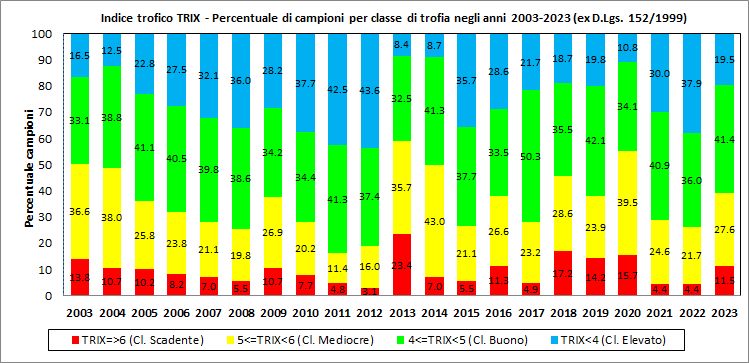 Percentuale di campioni per classe di Indice trofico TRIX negli anni 2003-2023 (ex D.Lgs. 152/1999) (Fig. 2)