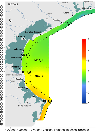 L’indicatore, utilizzando le classi di trofia ex D.lgs. 152/1999, vede raggiunti l’obiettivo Buono ai corpi idrici CE1_1, CE1_2 e ME2_1 (a nord e antistante la laguna di Venezia); i c.i. CE1_3 e ME2_2 presentano un valore medio di TRIX che rientra nella classe Mediocre, mentre il c.i. CE1_4 scende in classe Scadente.