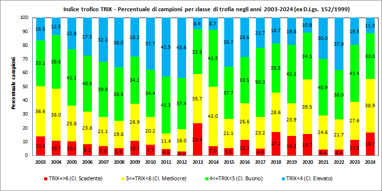 Percentuale di campioni per classe di Indice trofico TRIX negli anni 2003-2024(ex D.Lgs. 152/1999) (Fig. 2)