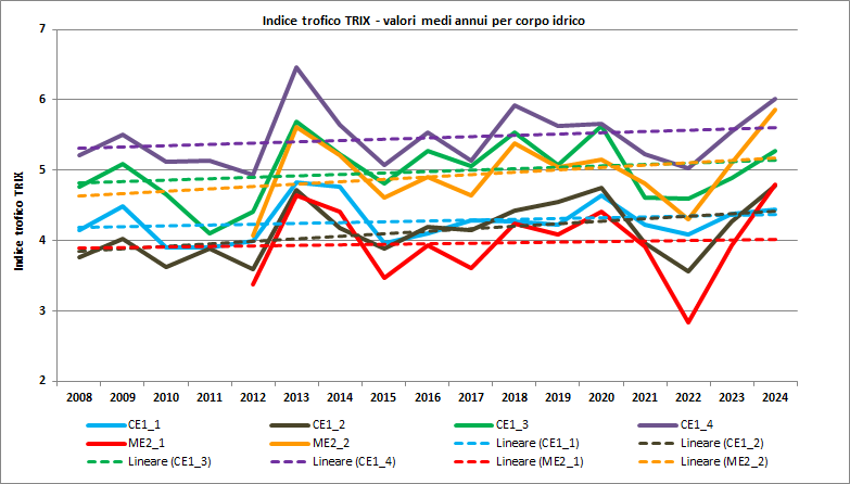 A livello di corpi idrici, nel 2024 i valori medi di TRIX sono risultati in aumento rispetto a 2023 e 2022, per effetto degli apporti dai fiumi, come sopra ricordato (grafico di Fig. 3); per questo motivo il trend viene indicato ancora come incerto, si osserva infatti una alternanza di situazioni in taluni casi particolarmente accentuata. Nel complesso della serie storica 2008-2024 le linee di tendenza mantengono ancora un andamento in ascesa, come conseguenza dei valori elevati di TRIX registrati negli anni 2013, 2014, 2018, 2020 e infine 2023 e 2024.