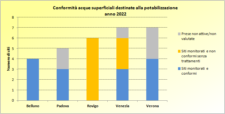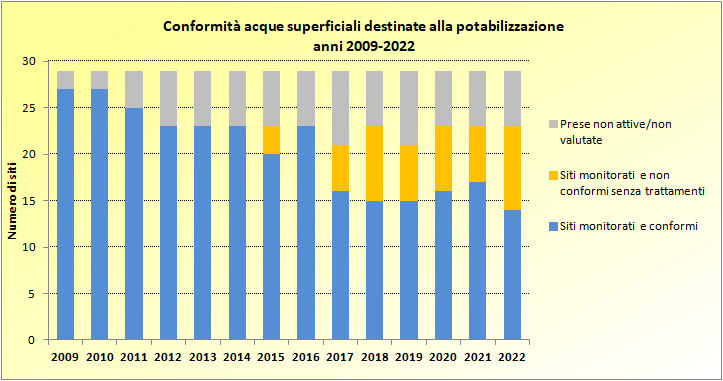 fig. 2 - Conformità delle acque superficiali destinate alla potabilizzazione nel Veneto. Anni 2009-2022