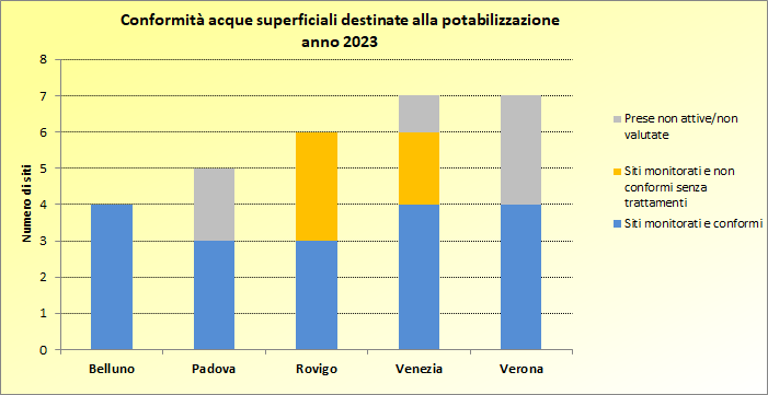 Conformità delle acque superficiali destinate alla potabilizzazione per provincia del Veneto. Anno 2023
