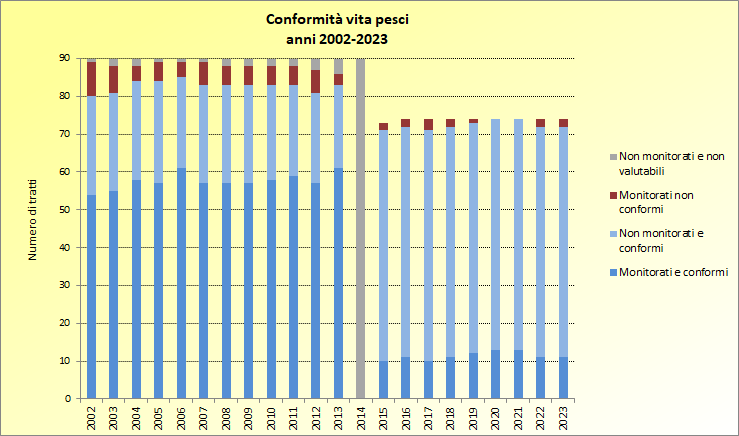 A partire da gennaio 2014 il monitoraggio è stato sospeso, così come previsto dalle Direttive specifiche emanate in materia; tuttavia con il Decreto-Legge 24 giugno 2014, n. 91 è stato disposto che i programmi di monitoraggio esistenti ai fini del controllo delle acque per la vita dei pesci costituissero (di nuovo) parte integrante del monitoraggio delle acque superficiali, pertanto il campionamento è ripreso a partire dall’anno 2015.