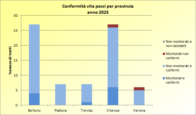 In totale ora in Veneto risultano designati e classificati 74 tratti o superfici di laghi (i tratti erano 90 fino al 2013); di questi, 13 sono stati monitorati nel corso del 2023 con l’elaborazione dei risultati del monitoraggio di 20 punti. La verifica della conformità non prevede necessariamente un monitoraggio routinario; infatti dopo il primo anno di campionamento mensile la frequenza di campionamento può essere ridotta o il punto può essere esentato dal campionamento. In particolare, nel corso del periodo 2015-2023 sono stati sottoposti a monitoraggio solamente i tratti che nel periodo 2011-2013 erano risultati non conformi, esentando nel contempo dal campionamento i tratti (o laghi) che nello stesso periodo sono sempre risultati idonei.
