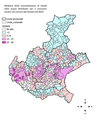Suddividendo i valori delle mediane in classi di concentrazione di nitrati (<5, tra 5-14, 15-24 e 25-50 mg/l) si è rappresentata spazialmente la concentrazione di NO3- nel territorio regionale. Le più alte concentrazioni sono state registrate in alcuni territori della provincia di Verona, mentre le aree bianche rappresentano i comuni dove non è stato possibile elaborare la mediana.