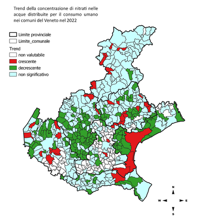 La valutazione dell'indicatore per l'anno 2022 continua ad essere positiva in quanto in tutta la Regione le mediane calcolate non superano mai il valore previsto dal D.Lgs. 31/01 per questo parametro. La mediana comunale massima riscontrata nell’anno è stata di 32 mg/l di NO3, inoltre nel 97 % dei comuni, con analisi nel 2022, il valore della concentrazione dei Nitrati è pari a meno della metà del limite di legge.