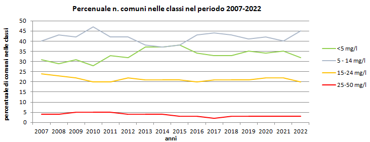 Considerando il la mappa di Fig.2 e il file dati, che descrivono la percentuale di comuni nelle diverse classi di concentrazione nel periodo 2007-2022, si può affermare che essa si è sostanzialmente assestata nei seguenti valori: circa il 35% dei comuni non presenta nitrati, in circa il 40% l’acqua contiene meno di 14 mg/l di NO3 e circa il 22% ha a disposizione acqua con meno di 25 mg/l di NO3. La percentuale di comuni con le più alte concentrazioni di NO3 si è attestata a meno del 3%.
