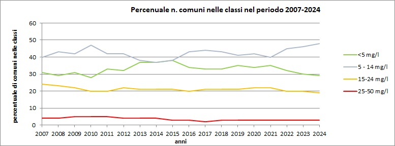 Considerando la mappa di Fig. 2 e il file dati, che descrivono la percentuale di comuni nelle diverse classi di concentrazione nel periodo 2007-2024, si può affermare che essa si è sostanzialmente assestata nei seguenti valori: circa il 35% dei comuni non presenta nitrati, in circa il 40% l’acqua contiene meno di 14 mg/l di NO3 e circa il 22% ha a disposizione acqua con meno di 25 mg/l di NO3. La percentuale di comuni con le più alte concentrazioni di NO3 si è attestata a meno del 3%.