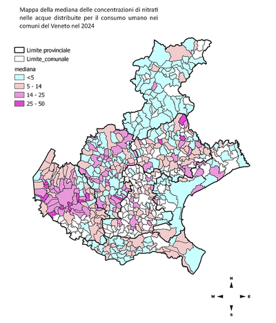 Suddividendo i valori delle mediane in classi di concentrazione di nitrati (<5, tra 5-14, 15-24 e 25-50 mg/l) si è rappresentata spazialmente la concentrazione di NO3- nel territorio regionale. Le più alte concentrazioni sono state registrate in alcuni territori della provincia di Verona, mentre le aree bianche rappresentano i comuni dove non è stato possibile elaborare la mediana.