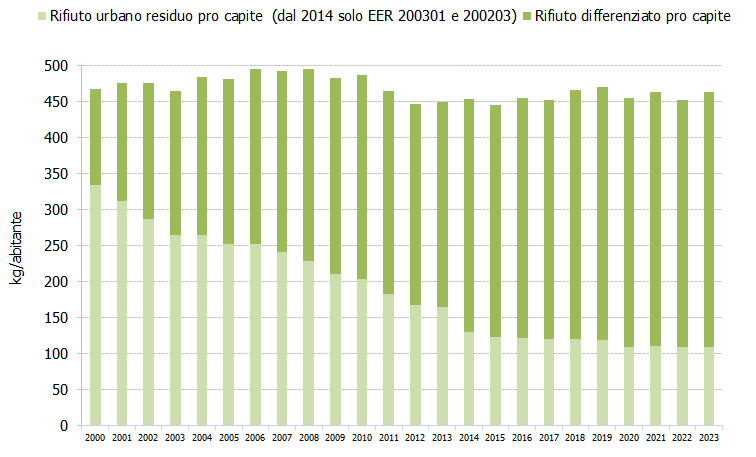 L’andamento dell’indicatore dal 2000 al 2023 evidenzia una progressiva diminuzione della produzione pro capite di rifiuto urbano residuo. Il RUR nel 2023 è pari a 110 kg/abitante, mantenendosi pressoché costante rispetto all’anno precedente.