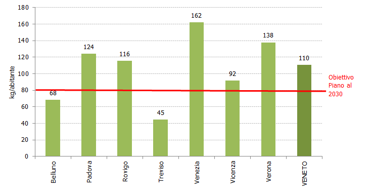 Il valore di riferimento è quello previsto dall’aggiornamento del Piano Rifiuti (DGRV 988 /2022) al 2030 pari a 80 kg/abitante.