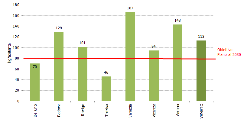 Il valore di riferimento è quello previsto dall’aggiornamento del Piano Rifiuti (DGRV 988 /2022) al 2030 pari a 80 kg/abitante.