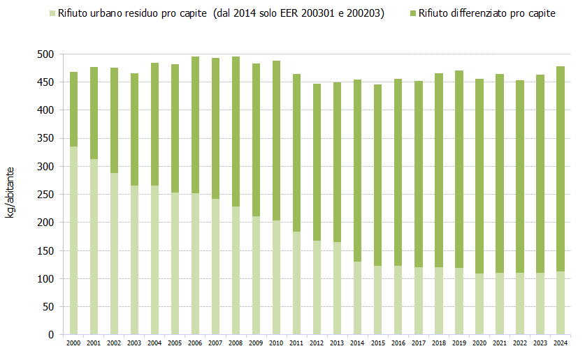 Negli anni si nota come il RUR pro capite sia diminuito a vantaggio di un aumento della raccolta differenziata (tutto quello che viene raccolto in modo differenziato al lordo degli scarti), andamento che si conferma anche nel 2024 con un valore pari a 113 kg/abitante.