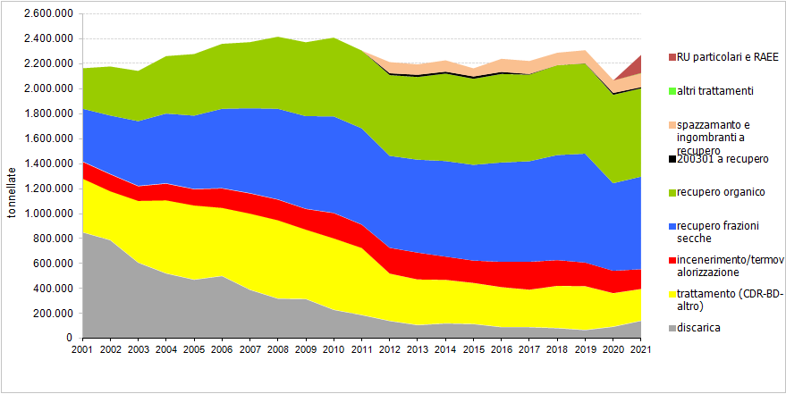 Il riferimento utile per valutare complessivamente la bontà di un sistema di gestione dei rifiuti urbani può essere identificato dalla percentuale di raccolta differenziata, che valuta a monte l’efficacia dei sistemi di raccolta, e dalla destinazione dei rifiuti raccolti. In questo senso risulta utile confrontare il dato regionale di rifiuto smaltito in discarica (pari al 6% dei rifiuti prodotti nel 2021) rispetto alla media nazionale (20% dei rifiuti prodotti nel 2020 - Rapporto Rifiuti Urbani Edizione 2021 - ISPRA).