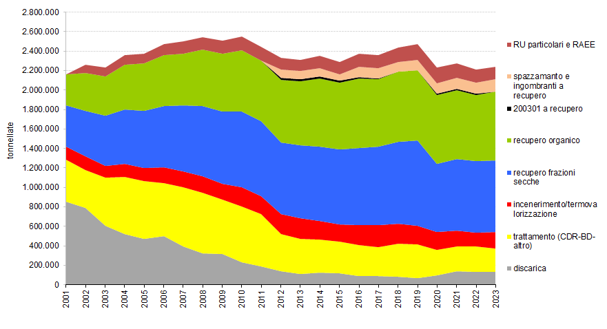 Destinazione dei rifiuti urbani prodotti nel Veneto in tonnellate. Anni 2001-2023