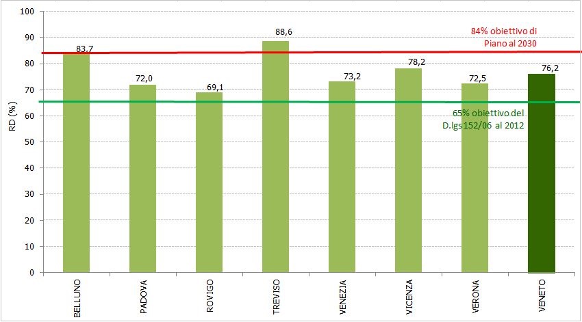 La percentuale di raccolta differenziata calcolata con il metodo nazionale è pari a 76,2%. Tale valore consente al Veneto di superare ormai da molti anni l’obiettivo del 65% previsto della normativa nazionale, collocandosi al primo posto tra le Regioni italiane. Tutte le province oltrepassano l’obiettivo di raccolta differenziata del 65% previsto dal d.lgs. 152/06 per il 2012 e Treviso con 88,6% supera anche l’obiettivo del Piano Regionale Rifiuti previsto per il 2030.
