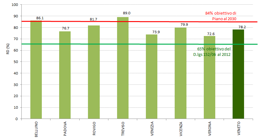 La percentuale di raccolta differenziata calcolata con il metodo nazionale è pari a 78,2%. Tale valore consente al Veneto di superare ormai da molti anni l’obiettivo del 65% previsto della normativa nazionale, collocandosi al primo posto tra le Regioni italiane. Tutte le province oltrepassano l’obiettivo di raccolta differenziata del 65% previsto dal d.lgs. 152/06 per il 2012 e Treviso con 89,0% e Belluno con 86,1% superano anche l’obiettivo del Piano Regionale Rifiuti previsto per il 2030.