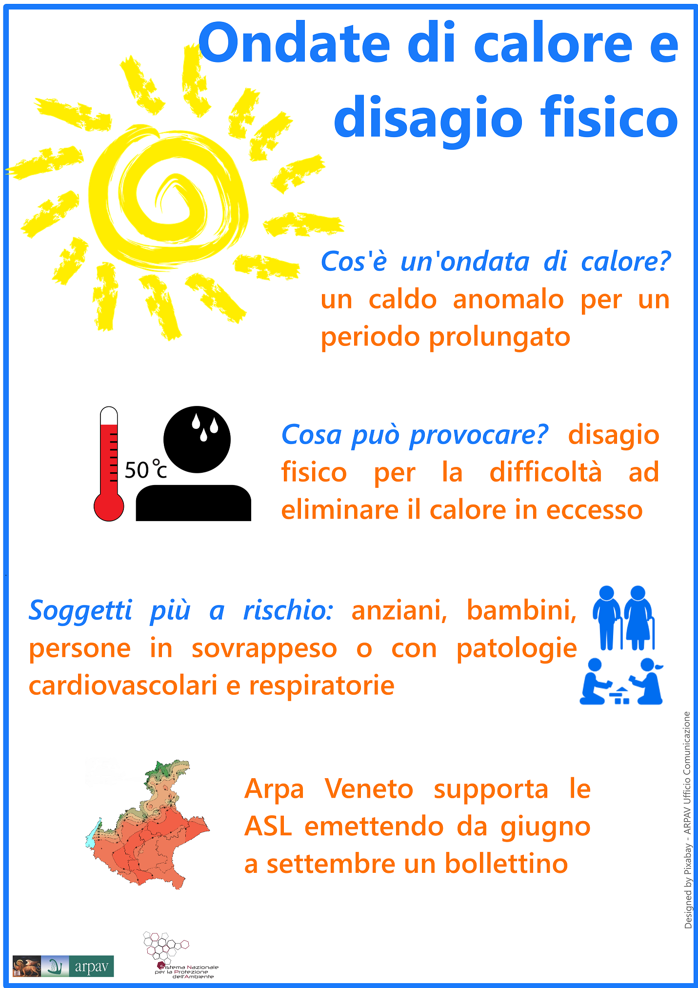 Le ondate di calore rappresentano un rischio socio-sanitario. A supporto delle Asl del territorio nella gestione di questa criticità estiva, da giugno a settembre Arpav emette quotidianamente una previsione del disagio fisico prevalente e della qualità dell’aria in relazione ai livelli di ozono per le quattro zone climatiche che caratterizzano il Veneto dal punto di vista del caldo estivo.