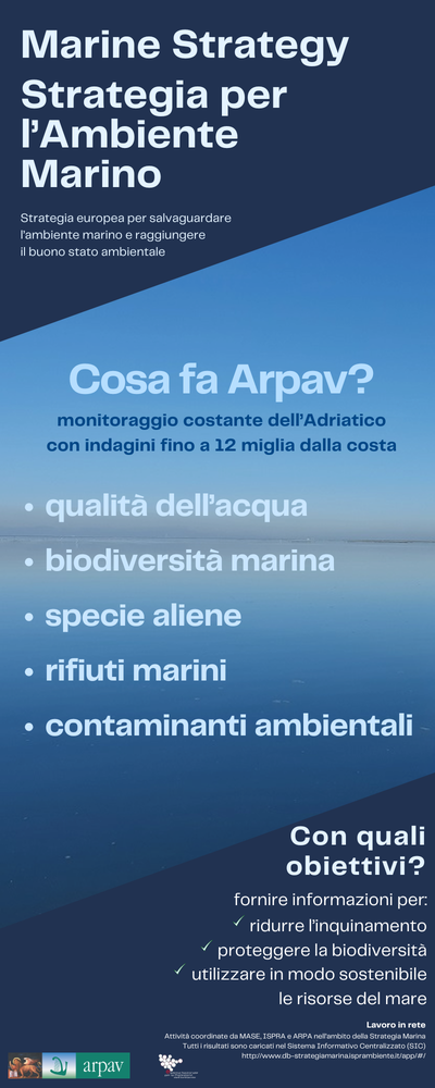 Arpav partecipa attivamente alle attività di monitoraggio nella sottoregione Adriatico, con campagne annuali in mare fino a 12 miglia dalla costa. Tra i parametri monitorati la qualità delle acque, la presenza di specie aliene, contaminanti chimici, rifiuti spiaggiati e microplastiche galleggianti.