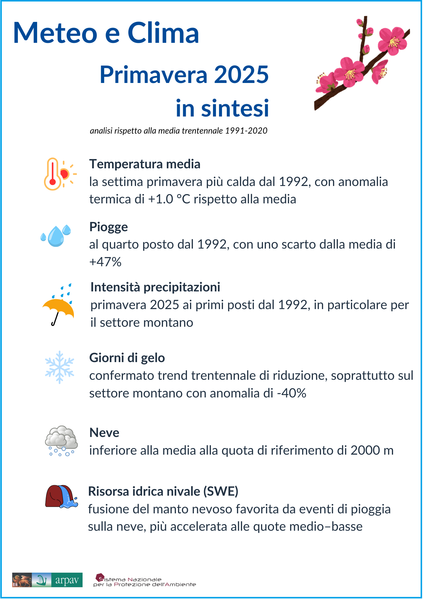 La primavera meteorologica 2025 è la settima più calda dal 1992 per temperatura media, con un’anomalia di +1.0 °C rispetto alla media climatica 1991–2020. Le temperature minime primaverili sono le quarte più alte dal 1992, con un’anomalia di +1.3 °C.