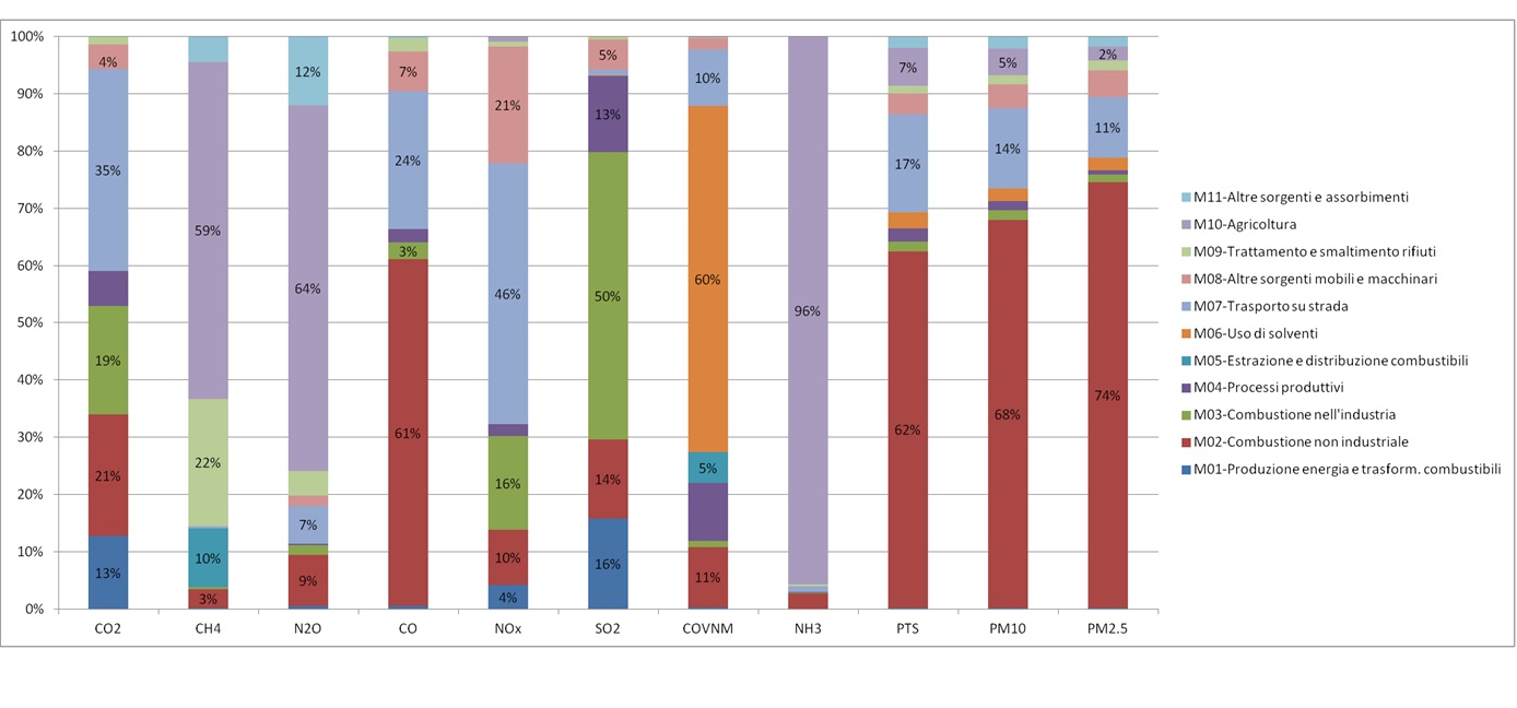 - macroinquinanti (espressi in tonnellate/anno) - CO (monossido di carbonio), COVNM (composti organici volatili non metanici), NH3 (ammoniaca), NOx (ossidi di azoto), PTS (polveri totali sospese), PM10 (polveri fini aventi diametro aerodinamico inferiore a 10 µm), PM2.5 (polveri fini aventi diametro aerodinamico inferiore a 2.5 µm), SO2 (biossido di zolfo);