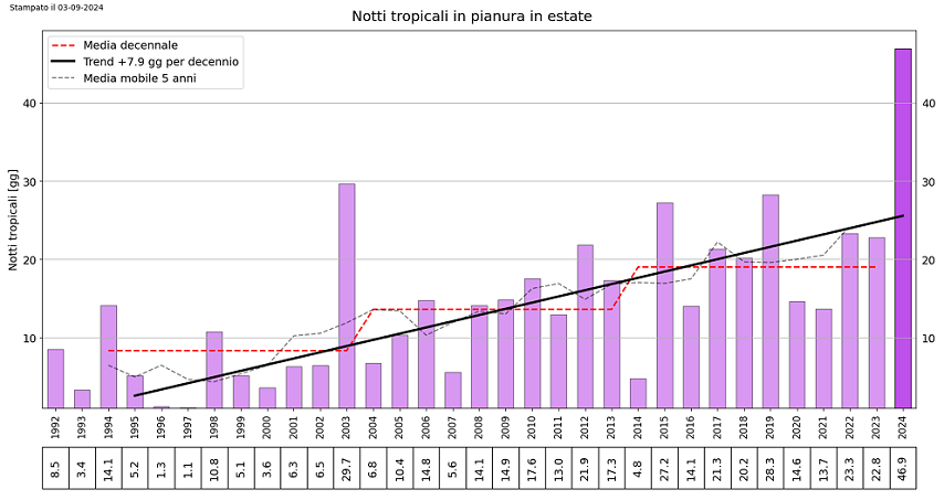Numero di notti tropicali (notti in cui la temperatura minima non scende sotto i 20 °C) registrate sulla pianura veneta nel periodo 1992-2024