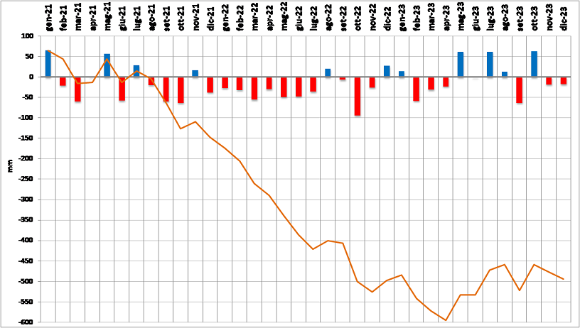 Differenza rispetto alla media 1993-2020 delle precipitazioni mensili (istogrammi) e somma delle differenze nei 36 mesi da gennaio 2021 a dicembre 2023 (linea spezzata arancione). Valori in mm stimati sulla regione Veneto. Ad aprile 2023 il deficit pluviometrico medio aveva raggiunto i 600 mm