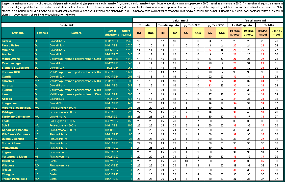 Tabella relativa ad alcuni indici climatici calcolati per il periodo estivo 2011, associati al parametro temperatura, per un set di 32 stazioni rappresentative del territorio regionale.