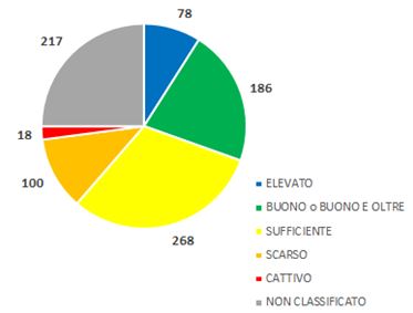 La figura 3 presenta lo stato chimico (colorazione del centroide del corpo idrico lacustre) e lo stato o il potenziale ecologico (colorazione del corpo idrico lacustre) relativi al sessennio 2014- 2019 approvati con DGR n.3/2022. Nella fig. 4 i corpi idrici lacustri divisi per classi di qualità; i valori rappresentano il numero dei corpi idrici.