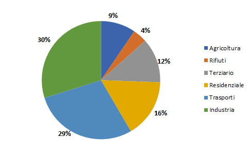 - Settori emissivi più rilevanti: industria (30%) e trasporti (29%)