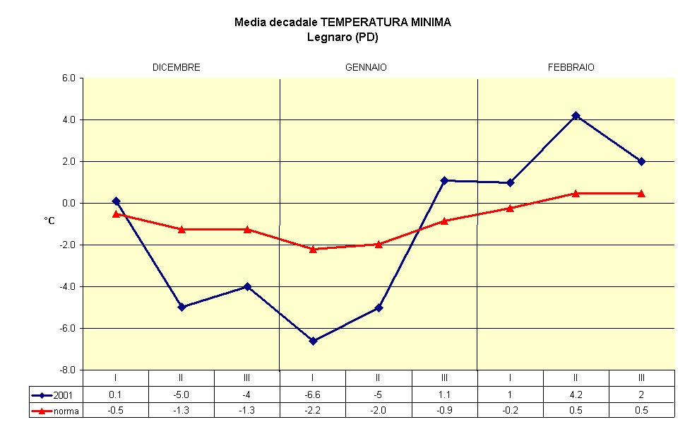 Andamento della temperatura minima decadale a Legnaro nel corso dell'inverno