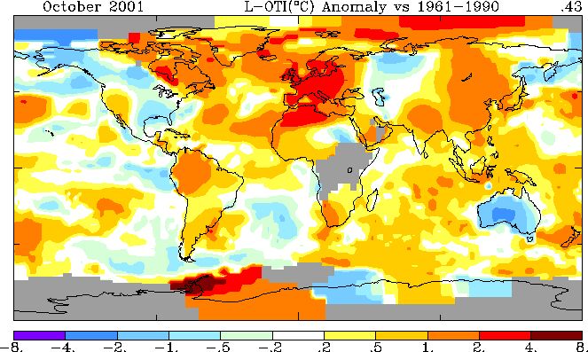 Anomalia termica per il mese di ottobre su scala planetaria (fonte: NOAA).