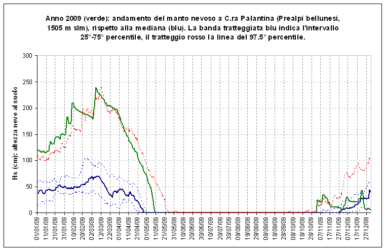 Andamento del manto nevoso giornaliero a Casera Palantina nel corso del 2009 e intervalli statistici di riferimento.
