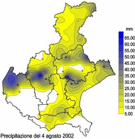 Precipitazioni cumulate sul territorio regionale il 4 agosto 2002.
