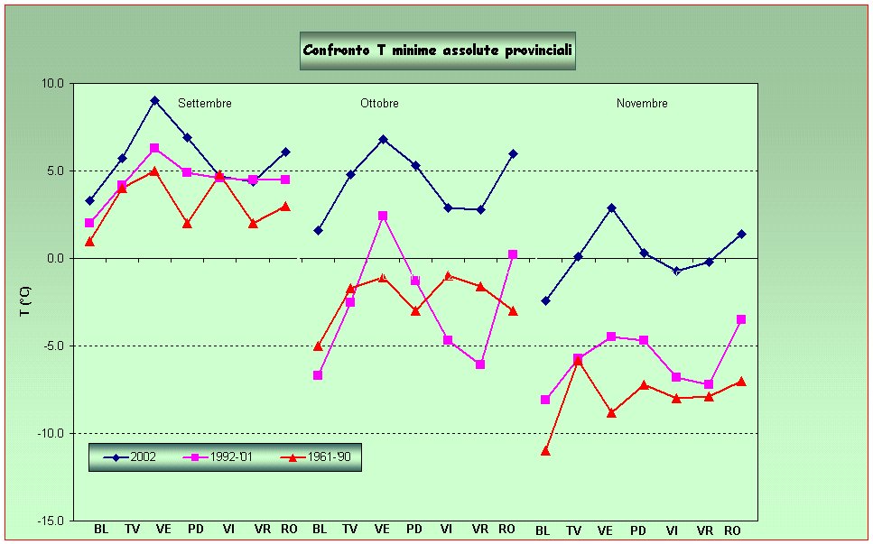 Confronto tra le le temperature minime assolute provinciali registrate nell'autunno 2002 rispetto alle minime assolute di archivio
