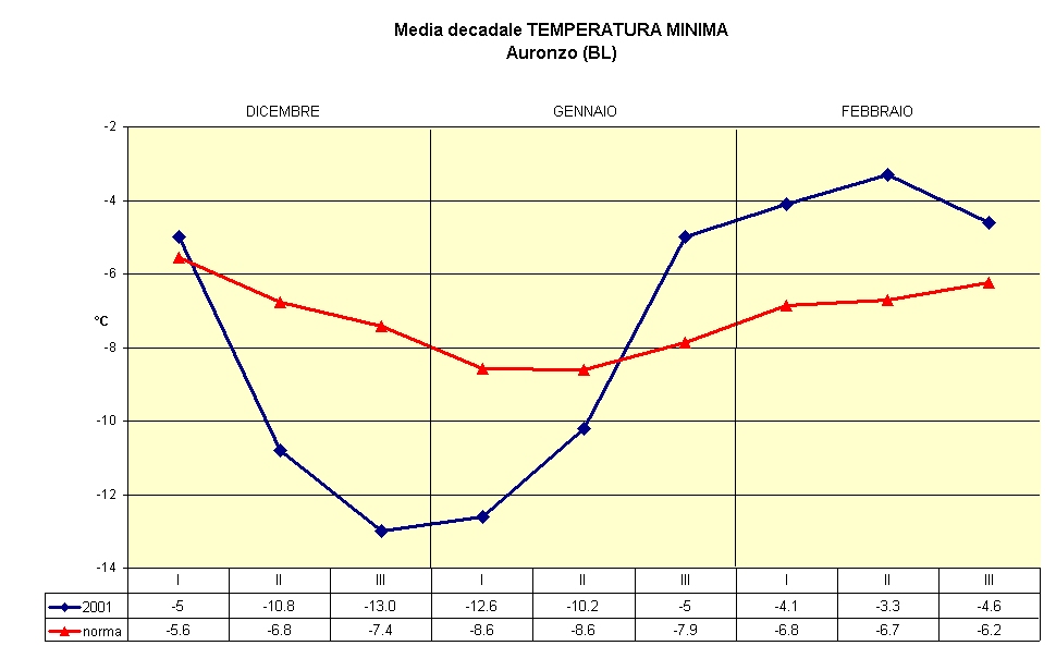 Andamento della temperatura minima decadale ad Auronzo nel corso dell'inverno