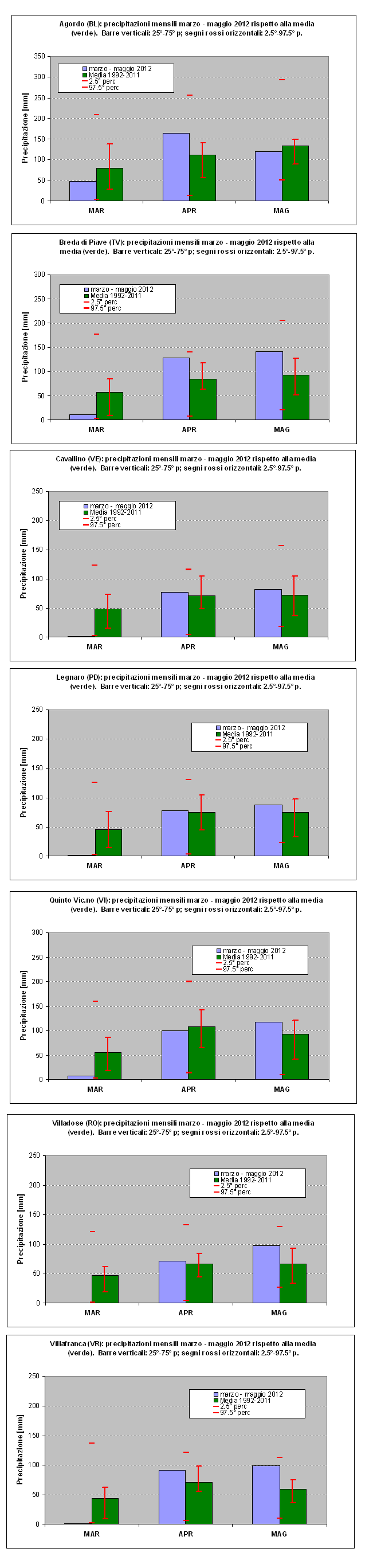 Istogrammi di precipitazione mensile in alcune stazioni rappresentative dei capoluoghi di provincia nel periodo primaverile 2012.
