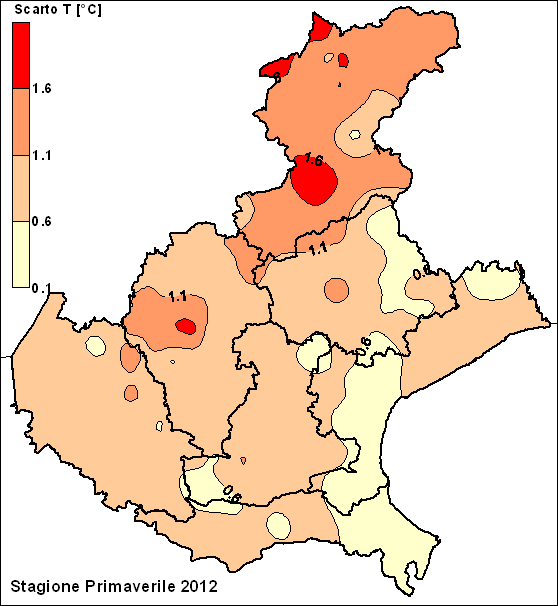 Mappa regionale (spazializzazione con metodo Kriging) dello scarto fra la temperatura media giornaliera della primavera 2012 e quella media stagionale da inizi anni '90.