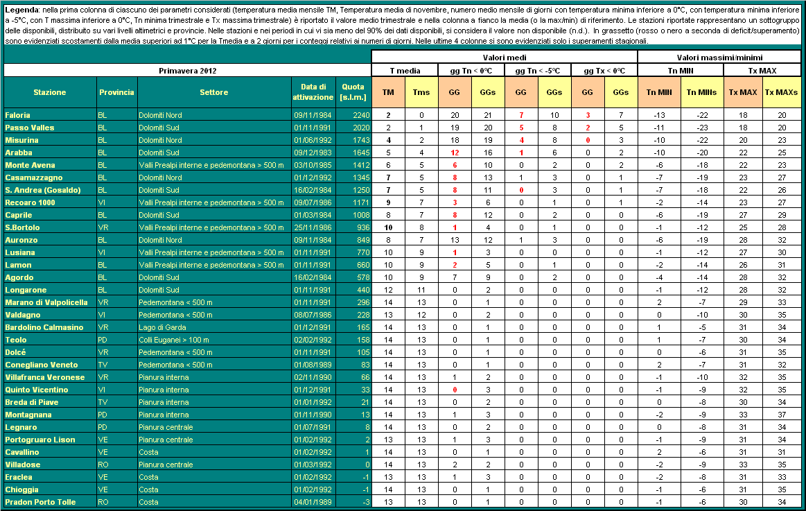 Tabella relativa ad alcuni indici climatici calcolati per il periodo primaverile 2012, associati al parametro temperatura, per un set di 32 stazioni rappresentative del territorio regionale.