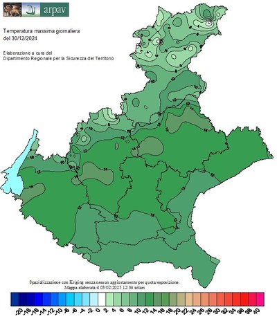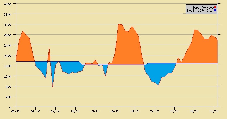 Il mese di Dicembre 2024 inizia con due bellissime giornate grazie ad un promontorio mediterraneo. Si assiste ad un contenuto aumento delle temperature in alta quota, ma non nelle valli e non in pianura. Pertanto l’inversione termica cresce, specie nelle valli in ombra. Nel pomeriggio del 2 nubi alte giungono da ovest, primo segnale di una saccatura atlantica che dopo essersi approfondita sulla Francia, si avvicina al nord Italia. Il giorno 3 la suddetta saccatura è ormai sul Triveneto, dove il tempo peggiora con estesa copertura nuvolosa e deboli piogge sparse ed intermittenti; la neve scende sui monti, inizialmente oltre i 1400-1600 m e in serata fino sui 1100-1300 m. Si tratta di pochi mm nelle valli e di pochi cm di neve al suolo oltre il limite pioggia/neve. Il lieve maltempo perdura anche il 4 per la rimanente circolazione ciclonica e il passaggio del fronte freddo associato alla suddetta saccatura, responsabile di ulteriori precipitazioni sparse, anche a carattere di rovescio, nevoso oltre i 900-1100 m. Complessivamente gli apporti sono tutto sommato assai modesti tra 1 e 5 mm e concentrati sul settore dolomitico e la pianura meridionale, solo localmente si arriva a 5-10 mm in quota sulle Dolomiti tra i passi e le stazioni sui 2000 m, con un massimo di 20 mm sul Faloria, ma è un eccezione. Alla sera del 4 il tempo migliora e il freddo già presente in quota tende ad insinuarsi nelle valli e sulla pedemontana, ma non altrove. Nella giornata del 5 una dorsale consente di poter ritrovare il sole e il tempo stabile con accentuazione del freddo di notte grazie all’irraggiamento notturno, mentre l’aria un po’ più fredda mantiene le temperature diurne su livelli piuttosto bassi, nonostante il soleggiamento, specie in montagna: 5/7°C nei fondovalle prealpini e non più di 2/3°C a 1000 m, anche temperature negative nei settori in ombra alle stesse quote, mentre si osservano valori di 9/11°C in pianura. Il giorno 5 un fronte ondulante in arrivo da nord interessa la nostra regione nel corso della notte e del mattino con annuvolamenti irregolari e neve burrascosa fino sui 1100-1300 m sulle Dolomiti centro-settentrionali, prima di un miglioramento del tempo. L’avvezione di aria meno fresca, anteriore al fronte, determina un temporaneo rialzo termico in quota, ma non nei bassi strati atmosferici, dove il cuscinetto di aria più fredda resiste in parte, pur osservando un leggero aumento delle minime, anche delle massime nelle situazioni di lieve favonio. Il giorno 7 finisce la piccola dorsale responsabile del miglioramento del tempo iniziato nel pomeriggio del giorno prima. Nel corso del pomeriggio la nuvolosità tende ad estendersi ed intensificarsi ovunque con prime deboli precipitazioni nel tardo pomeriggio/sera, nevose fino a 300-600 m. Il giorno 8 lieve maltempo sulle Dolomiti occidentali e il basso Bellunese nella notte con 2-10 cm di neve, localmente fino a 15 in alta quota. Sulle Prealpi centro-occidentali maggiore perturbabilità con apporti di neve assai più consistenti, già al mattino, con 15-25 cm di neve fresca (18 cm ad Asiago e 13 a Bosco Chiesanuova). Il maltempo perdura anche in giornata, ma in maniera più lieve. In pianura la situazione è addirittura peggiore con 20-40 mm sulla pianura settentrionale, 30-50 mm su quella centrale e piogge decisamente più abbondanti su quella meridionale con cumuli da 50-70 mm, localmente oltre gli 80 mm (Porto Tolle 85.4 mm e Cavarzere 98.4 mm). Questo episodio è da collegare al transito di una saccatura atlantica, la cui parte meridionale si isola in depressione chiusa in grado di determinare un serio episodio pluvio-nevoso tra la Lombardia meridionale, l’Emilia Romagna e in maniera appena più marginale per più della metà del Veneto, sotto una linea che va da Verona a Bibione, più copioso man mano che si scende verso il Po. Alla sera del giorno dell’Immacolata un lieve ritorno da est porta altri mm e qualche cm di neve sulle Dolomiti orientali, mentre i fenomeni sono quasi del tutto esauriti in pianura. Il 9 la situazione migliora in parte sui monti, mentre gli effetti del minimo centrato sulla toscana continuano a determinare cielo coperto a deboli fenomeni sulla parte meridionale della regione. Lo stesso il giorno 10 per residua ciclonicità e presenza di aria ancora umida. Pertanto il cielo rimane coperto con debolissime precipitazioni, nevose fin sui 1000-1200 m. Al pomeriggio il minimo scende ulteriormente verso il centro dell’Italia con ingresso di correnti da nord-est favorevoli alle prime schiarite. Fa relativamente freddo, specie in montagna, anche per la permanenza della neve alle quote medie. Nei tre giorni successivi un’alta pressione mobile nord atlantica interessa tutto il nord Italia garantendo tre stupende giornate con freddo notturno; ormai siamo nelle notti più lunghe dell’anno ed in caso d’irraggiamento notturno i valori termici notturno sono bassi, tanto più che su molti settori montani la neve è presente. Molte gelate anche in pianura, ma soprattutto in montagna dove si oscilla tra -4 e -8°C, addirittura -13°C ad Asiago il 12 all’alba. In giornata il contesto rimane fresco. Nella giornata del 13 e la notte del 14 l’alta pressione s’indebolisce per l’avvicinarsi di una saccatura atlantica responsabile in un primo tempo dell’aumento della nuvolosità stratiforme medio-alta e a fine giornata di un peggioramento piuttosto modesto con neve fino a bassa quota, nonostante si tratti solo di tracce o di 1-2 cm sotto i 600 m e di 4-6 cm tra i 1000- 1600 m, localmente fino a 8-10 cm su alcune stazioni d’alta quota. L’asse di saccatura passa velocemente e il tempo migliora rapidamente nella giornata con ritorno del sole e del cielo sereno in un’atmosfera un po’ più fresca. Le temperature massime sono comprese tra 5 e 8°C in pianura e spesso inferiori a 2/4°C nei fondovalle prealpini e appena superiori a 0°C nelle valli dolomitiche. Il 15 l’alta pressione e l’arrivo di