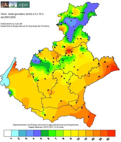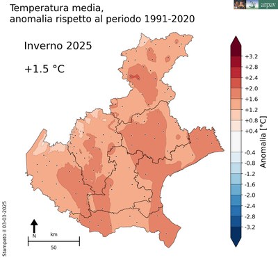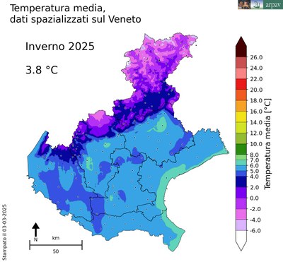 L’inverno 2024-2025 risulta, come il precedente, anomalo per vari aspetti, a livello sinottico con preponderanza dell’alta pressione atlantica e latitanza delle saccature con avvezione di aria polare o artica. Questo determina un’anomalia dal punto di vista termico, non così importante come l’inverno passato, che aveva registrato +2,3°C rispetto alla media 1991-2020, ma comunque di +1.5°C (Fig. 4a e 4b). La temperatura media a livello regionale è di 3.8°C contro i 4.5°C dell’anno scorso. Lo scarto della media è maggiore sul basso bellunese, su buona parte del trevigiano e del settore orientale della regione, mentre la situazione è più vicina alla norma sui settori occidentali, specie sulle Prealpi veronesi e vicentine. Grazie al supporto dei colori, la carta (Fig. 4b) mostra le temperature sulla regione, spesso con medie sotto zero in montagna, mentre si va da 4-6°C sulla pianura, anche tra 6 e 7°C sul litorale.