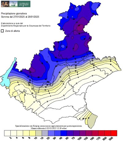 Il mese di Gennaio 2025 inizia con tempo ancora stabile, ma un po’ meno mite e con qualche annuvolamento per il graduale cedimento dell’alta pressione. Nel contempo una saccatura atlantica si approfondisce sulla Francia, ma senza effetti nella giornata del primo, che tutto sommato rimane soleggiata, nonostante i primi e temporanei annuvolamenti. Le temperature iniziano a diminuire, specie in quota. Il giorno 2 ulteriore cedimento dell'alta pressione, oramai confinata al solo bacino mediterraneo, mentre il maggiore approfondirsi della suddetta saccatura sulla Francia provoca il transito di un primo asse di saccatura sulla nostra regione con qualche fiocco in montagna, cioè tracce di neve sulle Dolomiti e qualche goccia sull’alto trevigiano, assieme a 2-3 cm di neve in Alpago oltre i 900 m. Le temperature continuano a diminuire e il freddo ritorna in montagna, ma è minore in pianura per assenza d’irraggiamento notturno. Si tratta della prima notte senza gelo in pianura, dopo 12 giorni. Il 3 il richiamo sud-occidentale di aria umida del giorno precedente viene rapidamente sostituito dall'ingresso di correnti nord-occidentali di aria più secca e più fredda, assieme al formarsi di una dorsale post frontale. Pertanto il tempo migliora, già dall'alba di venerdì e si mantiene stabile e ben soleggiato anche il 4 del mese. Il freddo giunto in quota il 3 con -18.8°C in Marmolada, ma anche -9/-10°C a 2000 m e le prime forti gelate nelle solite nicchie fredde (-17.1 nella piana di Marcesina e -15.6°C in Val Visdende) tende ad insediarsi maggiormente il 4 del mese, specie nelle valli, dove i minimi toccano i 10/14°C sotto zero, anche in pianura dove vi sono punte di -4/-6°C sulla pedemontana. In giornata il freddo si mantiene in montagna e su molti settori si rimane sotto zero, mentre si raggiungono i 3/4°C in Valbelluna e i 4/8°C in pianura grazie al buon soleggiamento diurno. Il 5 condizioni pressoché identiche con il mantenersi della dorsale con flusso di aria ancora fredda nord occidentali, anche se alla sera le correnti tendono ad orientarsi da sud-ovest per l’approfondirsi di una nuova saccatura atlantica sulla Francia. Nella giornata dell’Epifania il settore caldo della suddetta saccatura giunge sulla nostra regione determinando piogge sparse qua e là con locale gelicidio in alcune valli montane, mentre qualche fiocco di neve cade nella notte tra il 5 e il 6 mattina, ma si tratta di tracce di neve. Alla sera dello stesso giorno il fronte freddo si addossa alle Alpi e il tempo inizia a peggiorare sul Veronese e sulle Dolomiti nord-occidentali con prime piogge e un po’ di neve oltre i 1100-1400 m. Tra la notte e il mattino del 7 il fronte transita sulla nostra regione con diffuse precipitazioni tra monti e pianura centro-settentrionali: sulla fascia prealpina, Dolomiti meridionali e parte alta della pedemontana cadono da 20 a 40 mm, localmente fino a 50-60 mm con neve significativa oltre i 1600-1800 m, mentre più a sud e più a nord i quantitativi sono via via minori e spesso inferiori a 10 mm, anche fino a 1-2 mm sulle estreme zone meridionali al confine con il territorio emiliano. L’assenza di freddo mantiene il limite pioggia neve sopra i 1400-1500 m sulle Prealpi e 1100-1300 m sulle Dolomiti. Subito dopo il passaggio di quel fronte, il tempo migliora già nel pomeriggio del 7 con ampi rasserenamenti grazie al formarsi di una temporanea dorsale post frontale. Miglioramento che si conferma nella giornata dell’8 assieme ad un calo delle minime. Però, mentre il tempo risulta buono, un nuovo asse, legato alla vasta saccatura presente sull’Europa centro-settentrionale si approfondisce sulla Francia determinando una nuova fase di maltempo ad iniziare dalle Prealpi occidentali in serata. Nella notte e nella mattinata del 9 il fronte transita sulla nostra regione dando luogo ad un episodio pluvio-nevoso, assai modesto su gran parte del territorio regionale, ad eccezione delle Prealpi occidentali e dell’Alpago, dove cadono da 30 a 40 mm, con un massimo di 46.2 mm a Turcati (Recoaro Terme), assieme ad altrettanti cm di neve sulle cime del Pasubio e del Gruppo del Carega oltre i 2000 m. Il limite pioggia neve scende a 1100-1300 m sulle Dolomiti, mentre si Mantiene sopra i 1800-1900 m sulle Prealpi. Nella giornata del 10 la residua ciclonicità e l’avvezione di aria via via più fredda, ma ancora umida, determinano condizioni inizialmente buone per un irruzione di aria secca e fredda, giusto dietro il fronte, ma al pomeriggio la nuvolosità aumenta e nella notte un po’ di neve cade ancora sulle Dolomiti, pochi cm: 1-3 cm, assieme ad un rinforzo dei venti. Lo stesso giorno la pseudo dorsale viene sostituita da una situazione dal rapido avvicinarsi di un fronte freddo che tende ad addossarsi all’arco alpino tra il pomeriggio e la sera, fronte senza effetti sul versante sud alpino, se non qualche annuvolamento sui settori settentrionali nottetempo e qualche fiocco notturno in alta quota sulle Dolomiti. Il giorno 11 il tempo si ristabilisce su tutta la regione grazie all’ingresso di correnti settentrionali di aria assai più fredda e secca. La nostra regione si trova tra una profonda saccatura bloccata sull’Europa orientale e un cuneo di alta pressione relativo alle propaggini dell’anticiclone delle Azzorre. Pertanto il tempo è bello, ma freddo, salvo qualche settore interessato dal Foehn tra alcune valli dolomitiche e soprattutto alle basse quote della fascia pedemontana e di alcune conche prealpine. Il giorno 12 le temperature scendono ulteriormente nei bassi strati per l’insinuarsi e la sedimentazione dell’aria fredda, mentre fa un po’ meno freddo oltre i 2200-2400 m. In ogni caso in questi giorni gela ovunque di notte, fa tra i -18 e -19°C in Marmolada, -15/-16°C nelle valli e sugli altopiani più freddi, -19/-13°C in molte valli dolomitiche e fino a -7/-8°C nel catino bellunese, ma anche -5/-6°C in alcuni settori della pianura. Anche i valori
