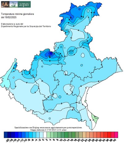 Il mese di Febbraio 2025, inizia con la presenza del minimo chiuso che richiama aria umida da sud-est. Il suo allontanamento verso sud è lento e il tempo rimane leggermente perturbato fino a sera, quando correnti di aria più secca giungono da nord-est a partire dalle Dolomiti. Il giorno 2 un cuneo di alta pressione che si presenta come una propaggine dell’anticiclone delle Azzorre favorisce une deciso miglioramento del tempo sulla montagna veneta e su buona parte della pianura, ad eccezione del catino bellunese e delle estreme zone meridionali che rimangono in parte sotto una cappa di nubi basse nelle prime ore del giorno. Grazie al buon soleggiamento le temperature massime salgono a 12/14°C in pianura, anche 8/10°C in alcuni fondovalle prealpini, mentre rimangono spesso sotto i 4/6°C a 1000/1200 m. L’alta pressione resiste fino al 6, pertanto il tempo rimane stabile con sole e cielo sereno, salvo locali nebbie nelle ore più fredde. Le temperature notturne sono consone o leggermente superiori alla media, mentre le massime si sono rivelate anormalmente elevate, specie in quota. L’apice della mitezza si verifica il 5 del mese, prima che un minimo in quota si stacchi dalla saccatura presente sull’Europa orientale e scivoli in maniera retrograda verso la Francia, interessando marginalmente il Veneto, già nella giornata dell’8, con aumento della nuvolosità e primi fenomeni nel pomeriggio sera sulla pianura e sulle Prealpi occidentali, in maniera assai più marginale altrove. Nella notte tra l’8 e il 9 la degradazione è più evidente con cielo coperto ovunque e precipitazioni che si estendono a tutta la regione. Si tratta di piogge deboli nella maggiore parte dei casi, eccetto sulle Prealpi occidentali dove risultano spesso moderate. Il limite neve inizialmente a 900-1100 m, s’innalza nel corso della mattinata per finire oltre i 1400-1600 m al pomeriggio. Cadono complessivamente da 5 a 15 mm, con apporti irrisori sulle Dolomiti o del tutto assenti su quelle nord-orientali, poco sul delta del Po, mentre le Prealpi vicentine e veronesi ricevono fino a 20-30 mm e localmente oltre 40 mm, come a Turcati 49,2 mm e al Rifugio la Guardia con 53.6 mm. Il giorno 10 una pseudo dorsale sembra voler formarsi sul nord Italia, però la prossimità di vari piccoli minimi di pressione e l'avvezione di aria fresca ed umida negli strati medi mantengono condizioni di tempo variabile con molte nubi e qualche debole fenomeno sotto forma di pioviggine e di debole neve oltre i 1300-1500 m. Le chance di schiarite sono molto limitate. Nei giorni 11 e 12 il tempo non varia in quanto l’umidità ristagna nei bassi strati e il flusso conserva una curvatura leggermente ciclonica, pertanto il cielo rimane nuvoloso con qualche fenomeno di debole intensità e lunghi intervalli senza precipitazioni. L’ambiente rimane fresco con debole escursione termica diurna, addirittura isotermia giornaliera in quota. Il giorno 13 si assiste a un parziale e temporaneo miglioramento per minore umidità iniziale e una maggiore ventilazione da ovest nord-ovest con calo delle minime e rialzo delle massime. Il gelo torna ad interessare alcuni settori a bassa quota, cosa che non accadeva da quasi una settimana e le massime superano i 10°C in pianura. Nel frattempo una goccia fredda, rimasta stazionaria per alcuni giorni sulla Manica, viene agganciata da una piccola ondulazione legata alla saccatura sull’Europa orientale e inizia a scendere lentamente verso le Alpi con aumento della ciclonicità serale sulla nostra regione. Il giorno 14 la suddetta goccia fredda scivola sul nord Italia, passando ad ovest della nostra regione, il ché favorisce un richiamo meridionale di aria umida, mentre l’aria fredda legata al minimo si sovrappone all’avvezione sottostante, cocktail favorevole a una fase di maltempo assai significativa su tutta la regione, con una nevicata significativa in alta quota: 20-30 cm, con limite che scende fino sui 600-800 m per l’arrivo di aria fredda in quota, ma con apporti irrisori sulle Dolomiti e fino a 10 cm a 1000 m sulle Prealpi occidentali. Le precipitazioni sono abbastanza variabile in montagna in quanto il flusso da nord-est pone molte valli in posizione di ombra orografica, specie alle quote più basse, mentre la pianura viene decisamente più colpita con piogge diffuse, anche copiose sul confine con il Friuli (parte orientale della provincia di Venezia) con 32.2 mm ad Eraclea, nonché sul delta del Po con un massimo di 43 mm a Porto Tolle – Pradon. Nelle ore centrali del 14 si alza la bora con forti raffiche sul litorale, ma anche sui colli Euganei. Si misurano venti da nord-est fino a 78-80 km/h sul litorale in tarda mattinata. Nei due giorni seguenti, cioè il 15 e il 16, il tempo risulta stabile, molto soleggiato e ventilato con cielo terso ed ottima visibilità. Si vedono le Alpi in lontananza, anche dalla parte meridionale del Veneto. Il contesto termico rimane fresco in quanto l’aria fredda insinuatasi nei bassi strati in corrispondenza del passaggio della goccia fredda tende a ristagnare per 48 ore. Si osservano diffuse gelate notturne, anche intense in montagna e quasi generalizzate in pianura, mentre il sole non riesce a mitigare realmente il contesto termico diurno, con massime di 6-8°C, salvo la pedemontana dei Lessini che subisce un lieve favonio con picchi a 10-11°C. Il giorno 17 la regione rimane sul confine tra una dorsale mediterranea ed una vasta saccatura centrata tra la Finlandia e l'ovest della Russia, la quale influenza solo marginalmente la nostra regione con nuova avvezione di aria fredda da nord-est nei bassi strati e da nord-ovest in quota. Il termometro scende a -15/-17°C in Marmolada, -10/-12°C sui passi Dolomitici attorno ai 2000 m, -8/-10°C nei settori abitati degli altopiani prealpini e le gelate sono generalizzate anche in pianura con minimi di 4/5°C sotto zero sulla pedemontana, valori piuttosto bassi per la fine della seconda decade di febbraio,