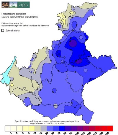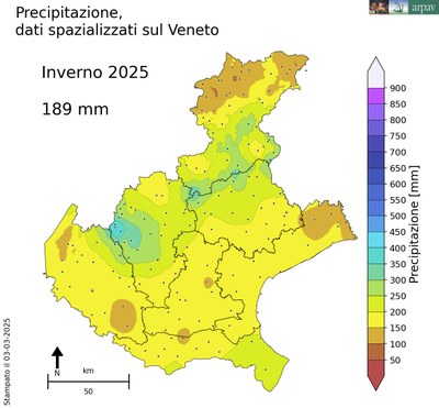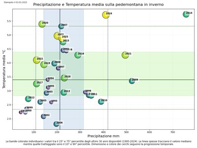 Le piogge a livello regionale dell’inverno 2024-2025 risultano appena oltre la media trentennale, inferiori a 200 mm, e assai minori rispetto a quelle dell’inverno precedente, risultate appena sotto i 300 m. I settori montani sono in linea con la media trentennale 1991-2020, la pedemontana è appena sopra la media con 220 mm contro i 215 mm normali, mentre in pianura la pluviometria stagionale è stata un po’ più abbondante, con 170 mm contro i 145 mm della media trentennale.