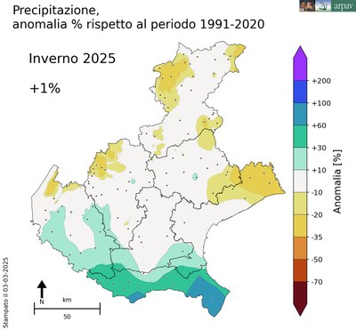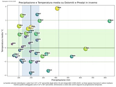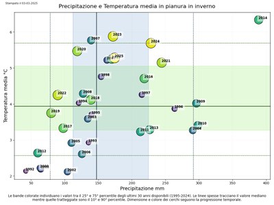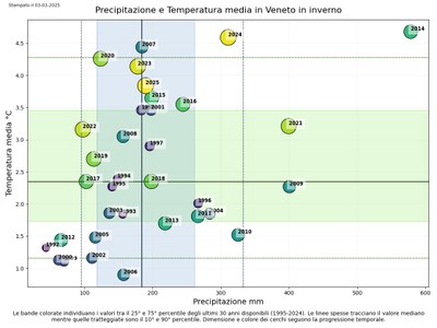 Complessivamente la stagione presenta 9 giornate perturbate (10% contro il 15% dell’inverno precedente): 2 a dicembre, 5 a gennaio e 2 a febbraio. Le giornate variabili sono state 31 cioè il 34% delle giornate, come nell'inverno 2023-2024 e contro il 45% del 2022-2023 (41 giorni). Infine le giornate di bel tempo, dinamicamente anticicloniche, sono state 50 (55%), il 13% in più rispetto all’anno precedente (38 giorni) e pressoché nella media di un inverno normale. Questi numeri danno una chiara idea della grande variabilità osservata quest’inverno in cui sono mancate le saccature di matrice atlantica con alimentazione fredda. Situazione che ha caratterizzato anche gli ultimi inverni, evidenziando una tendenza verso contesti sinottici diversi rispetto al passato.
